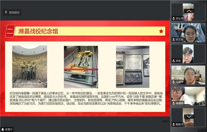 潍县战役是解放战争时期我军在华东战场上的第一个城市攻坚战,消灭了国民党军队的有生力量,拔掉了敌人的“鲁中堡垒”。党员们怀着敬仰之情参观学习潍县战役的全过程,并结合红色历史与实地学习的感受体会,通过历史图片、文物史料、影视资源等,向支部全体党员进行线上汇报和分享,再现惊心动魄、艰苦卓绝的潍县战役,深刻阐述“为谁当兵、为谁打仗”的宗旨观念,“战必胜、攻必克”的攻坚意志以及“光荣地进去,干干净净地出来”的纪律意识。