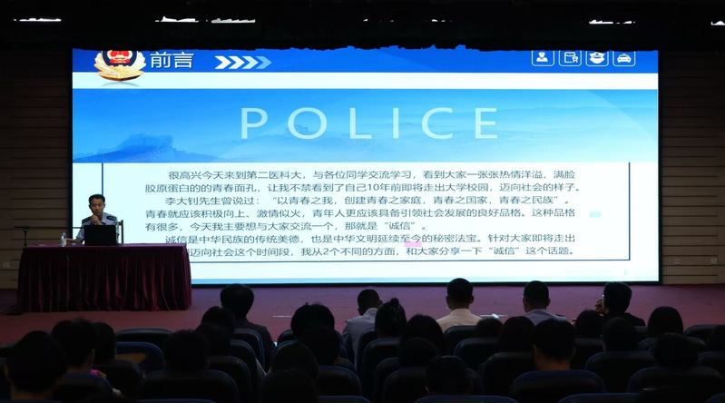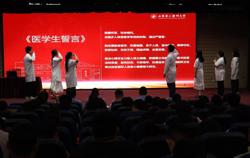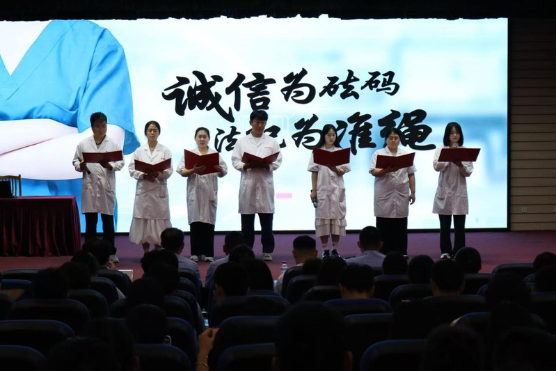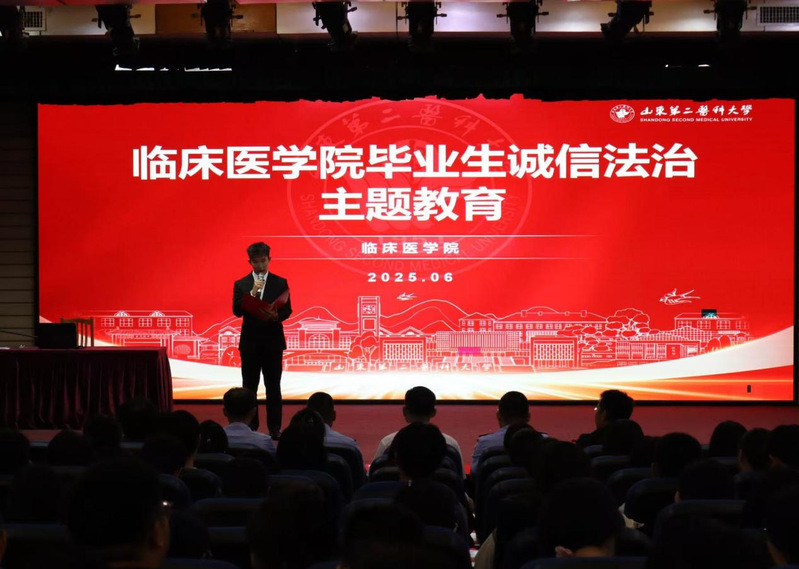活动特邀山东省潍坊监狱团委委员、四级警长李明作主题讲座。他紧密围绕诚信与法治主题,结合医疗行业特性,深刻剖析了诚信在医务工作者职业生涯中的基石作用,并通过真实案例警示诚信缺失与法律意识淡薄带来的严重后果。随后,毕业生代表张雪龙等七人以诗朗诵《生命的天平:以诚信为砝码,以法纪为准绳》深情演绎,用铿锵有力的语言诠释了诚信与法治对守护生命尊严和指引人生航向的非凡意义,深深触动了在场师生。在活动结尾,“健康所系,性命相托”的誓言再次回响,激励着每一位毕业生铭记初心、砥砺前行。