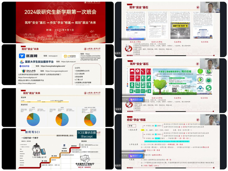 班会上,辅导员通过一系列真实案例,深入浅出地强调了校园安全的重要性。结合近期发生的火灾、交通事故、电信诈骗等多起安全事故,提醒同学们务必增强安全意识,严格遵守学校规章制度,杜绝使用违规电器,安全规范使用电动车,防范网络诈骗。在学业规划方面,辅导员详细介绍了学术型与专业型研究生在论文发表、专利申请、竞赛获奖等方面的具体要求,明确了不同层次期刊的分类与认定标准,强调了论文发表的时间节点与单位署名规范,并鼓励同学们尽早明确目标,合理安排时间,加强文献阅读与科研训练,逐步提升学术能力;在就业指导方面,辅导员分析了当前医学研究生的就业形势与主要去向,介绍了多个就业信息平台与公众号资源,建议同学们及时关注招聘信息,积极参与实习与实践,为顺利就业打下坚实基础。最后,辅导员与同学们直播连线互动,一对一解答同学们提出的问题。