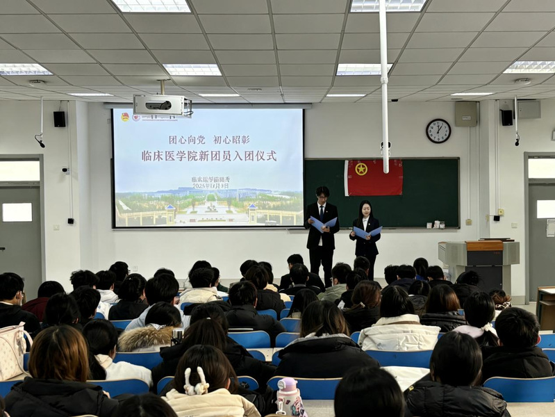 仪式在庄严的国歌声中拉开帷幕。刘刚向新团员表示热烈祝贺,并寄语同学们要以2025年最美医生、中国好医生、见义勇为勇士、齐鲁时代楷模、山东省道德模范、优秀校友张军桥烈士为榜样,将入团的光荣与责任“乐道济世”的校训和“健康所系,性命相托”的医学誓言紧密结合,珍惜时代机遇、不负青春韶华,让团徽在奋斗中熠熠生辉。主持人宣读新团员名单,团委书记为新团员代表颁发团员证并佩戴团徽。全体新团员面向鲜红的团旗庄严宣誓,铮铮誓言展现出新时代青年传承红色基因、肩负历史使命的坚定决心与青春朝气。团员代表宣读团员权利与义务,进一步强化新团员的责任意识与组织观念。新老团员代表依次发言,号召全体团员牢记誓言、践行使命,以实际行动为团组织增添光彩。仪式在《光荣啊,中国共青团》的激昂歌声中圆满落幕。
