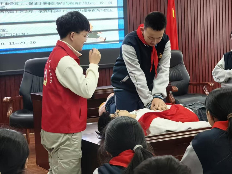 本次讲座由学生志愿者担任主讲,紧扣抢救“黄金4分钟”这一主题,结合真实案例与校园生活场景,系统讲解了心搏骤停的识别要点、紧急呼救流程以及心肺复苏操作流程。志愿者通过分步演示和关键动作解析,帮助中学生准确理解按压位置、深度、频率等核心要素,切实提升急救知识的针对性与可操作性。理论教学结束后,活动进入互动实操环节。中学生分组在模拟人教具上进行心肺复苏练习,学生志愿者全程提供“一对一”指导,耐心纠正动作细节,细致回应操作疑问。通过手把手教学与反复练习,参训学生初步掌握心肺复苏的基本要领,进一步巩固了急救技能的学习效果。